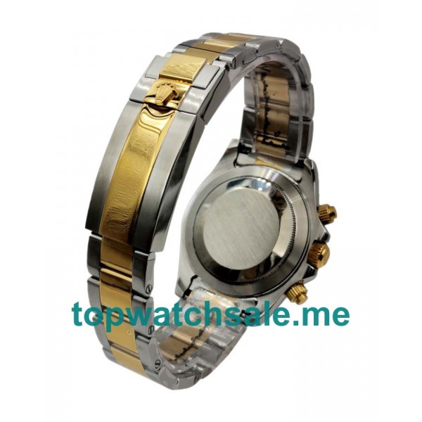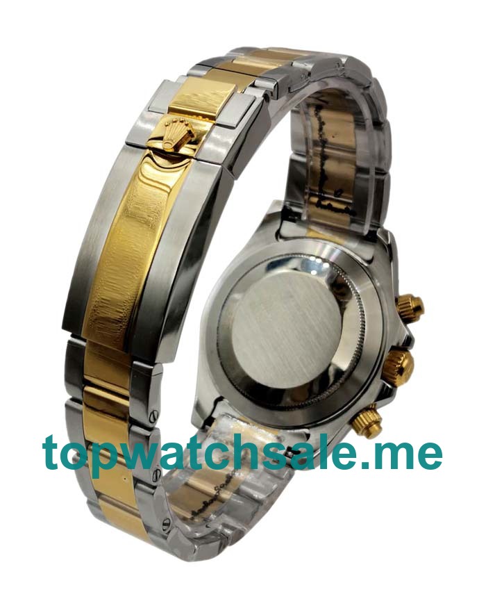 The perfect fake Rolex Daytona UK features a black dial adorned with gold Arabic numerals hour markers and includes a 40 mm gold bezel that is adorned with tachymeter. Presented on the steel & gold bracelet, this cheap replica Rolex with automatic movement looks luxurious and sporty.